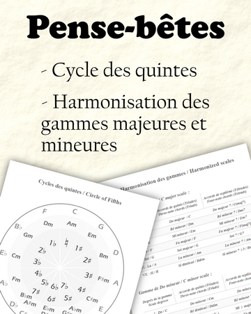 Dans tous les cahiers de musique, retrouvez un sommaire 51 entrées et également deux pense-bêtes pour la composition de morceaux : Cycle des quintes & Harmonisation des gammes majeures et mineures.